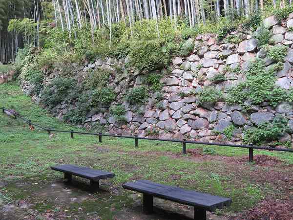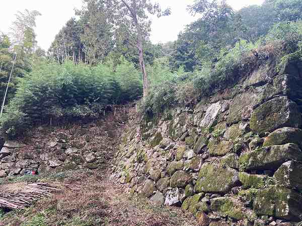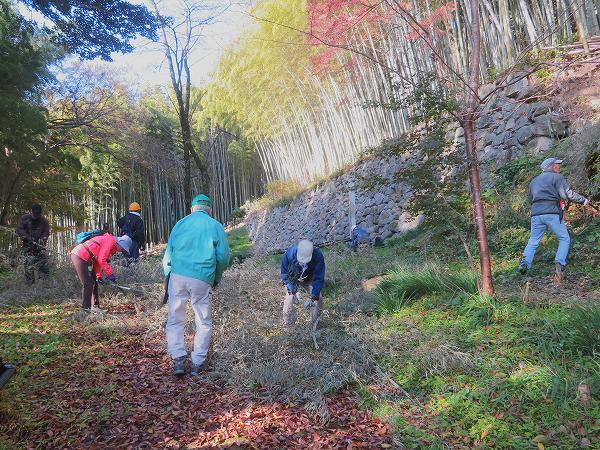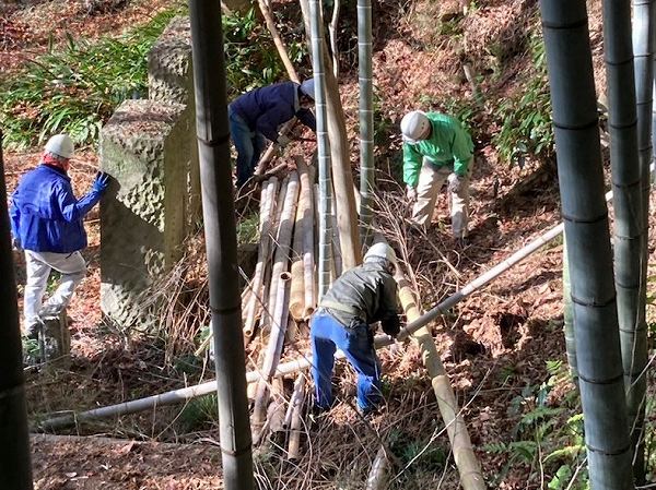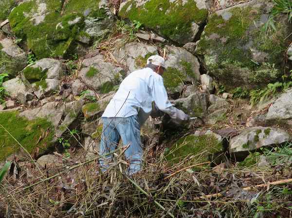 途中休憩を10時ごろにとり、後半には奥の石垣前に残った細竹の藪の整備を行いました。