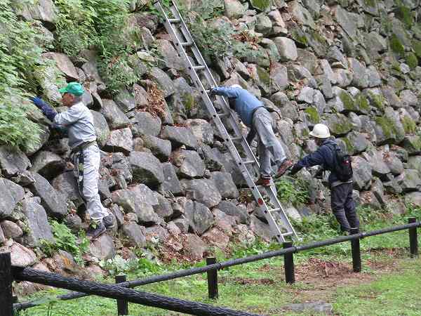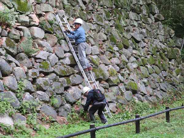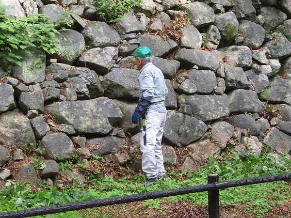 本日の作業は前回に続き英次館近くの高石垣およびその上部台地の整備と公園西側の広場前の大石垣の整備です。