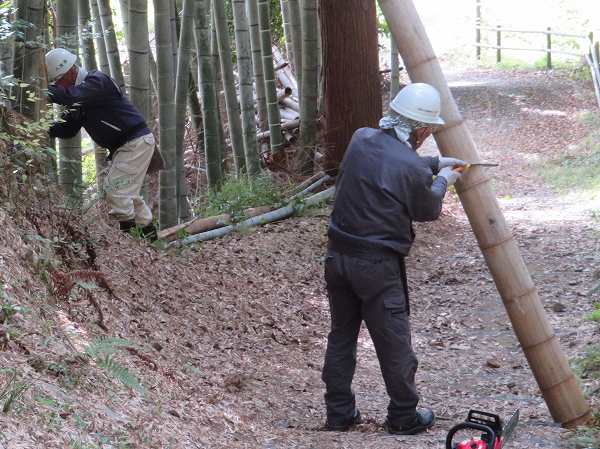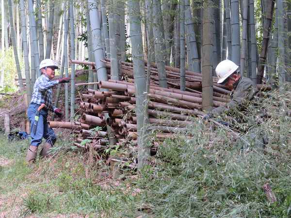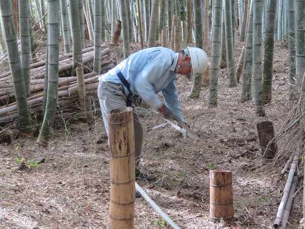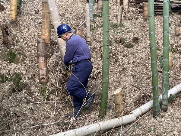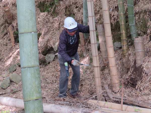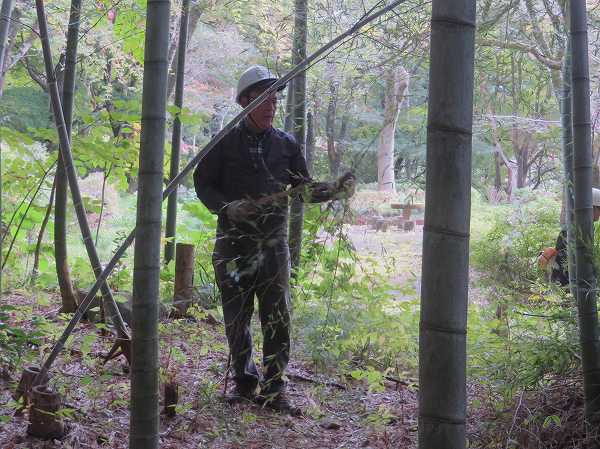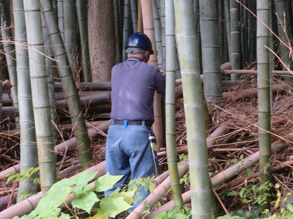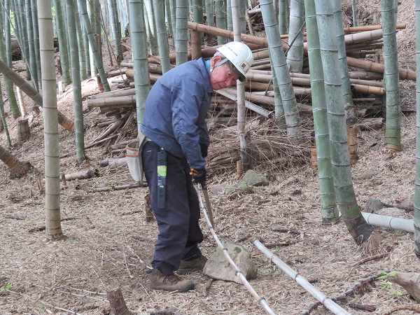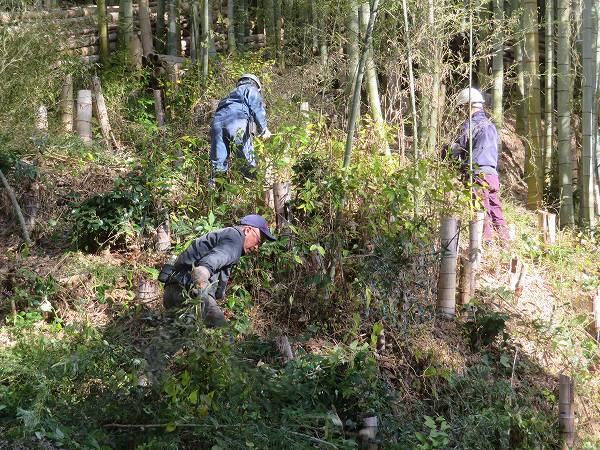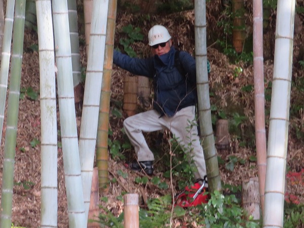 作業場所は前回に続き大石垣山側の竹林の整備です。数回連続しての整備となり かなりきれいになりましたが、十分でなく今回も続けました。