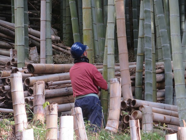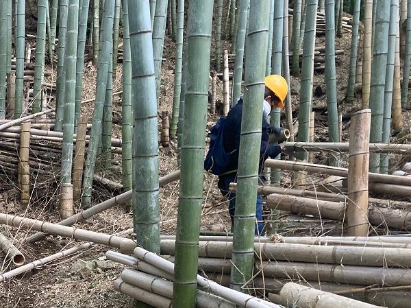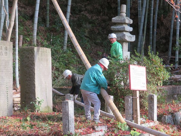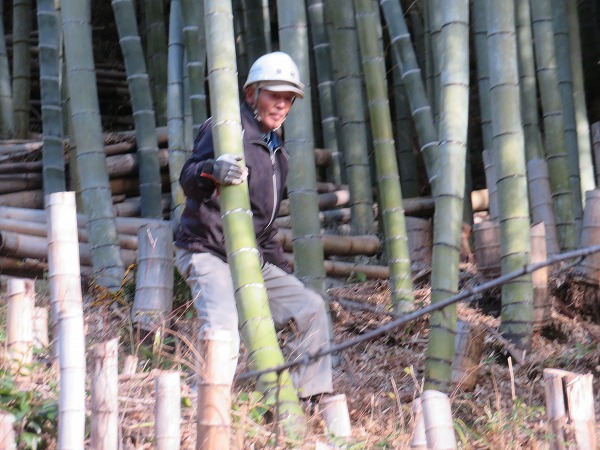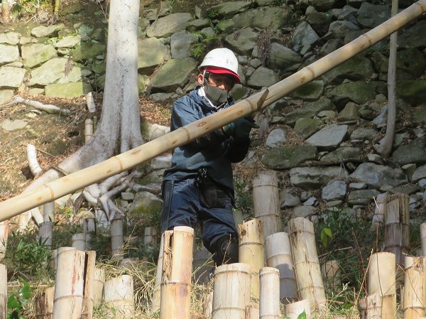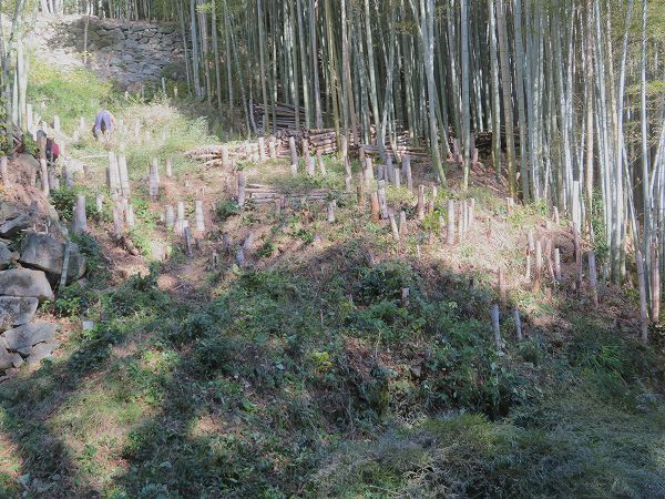 今日から竹林の整備となります。最初のこの日は大石垣下部の平地竹林の整備です。立ち枯れ竹が多くありこの整備です。竹林周りの笹竹も草刈り機で除草しました。