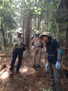 百百神社から9:10に入山し、直ぐ上の傾斜地にある立ち枯れ松を伐倒する。その後さらに30分先の檜林を抜けた場所が、常緑樹が密生して暗くうっとうしい為、今回はここを集中的に整備する。今回は山歩き女子の日比野さんも初参加で汗を流す。