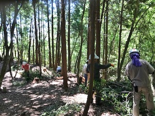 百百神社~45分ほど登った所の檜林の整備を久しぶりに実施。9人での作業で、谷側の倒木も大分片付き、檜林の細い常緑樹も除伐して次第に明るくなってきた。15時に下山する。