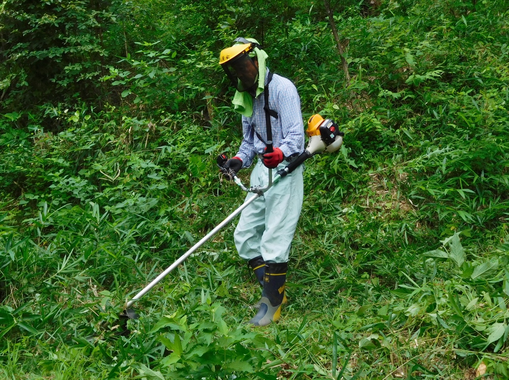 この日も暑い中15名の元気なおやじさんが集まり定例の活動を実施しました。作業は登山道にある円形展望台周辺の整備で 不要木の伐採、笹竹のカット、階段の除草などです。