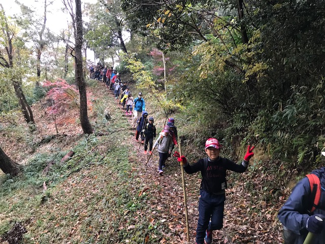 9時に八幡山公園に集合、19家族56人が参加。9時15分にスタート、途中何度か休憩を取りながら、12時15分に百百神社に下山する。