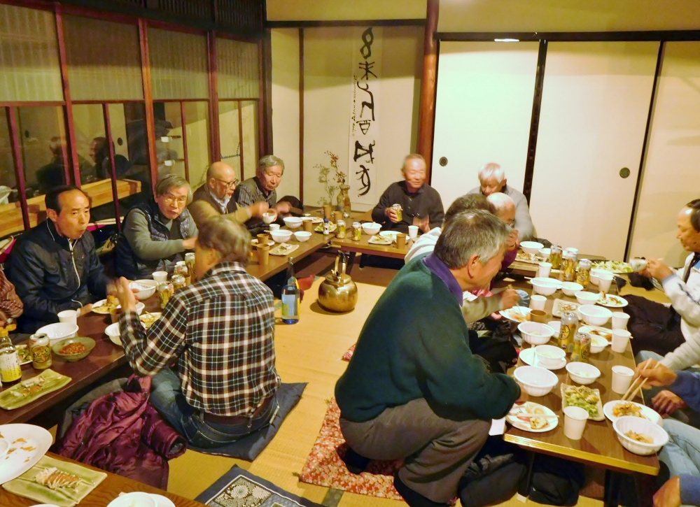 平成29年の忘年会が開催されました。場所は恒例となりました「なつかし館」で18時からの開催でした。料理はわざわざ箕面市から応援に駆けつけてくれたKoさんと女性会員のMoさん2人で作ってくれました。餃子、春巻き、てんぷらなど盛りだくさんで、酒もビール、日本酒、焼酎と飲み放題。宴会半ばでは各個人のコメントの発表もあり、本当に楽しい時間を過ごすことが出来ました。
