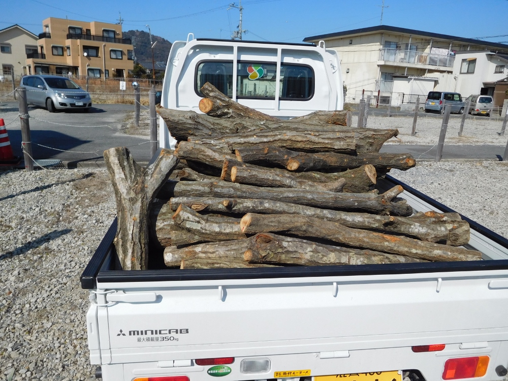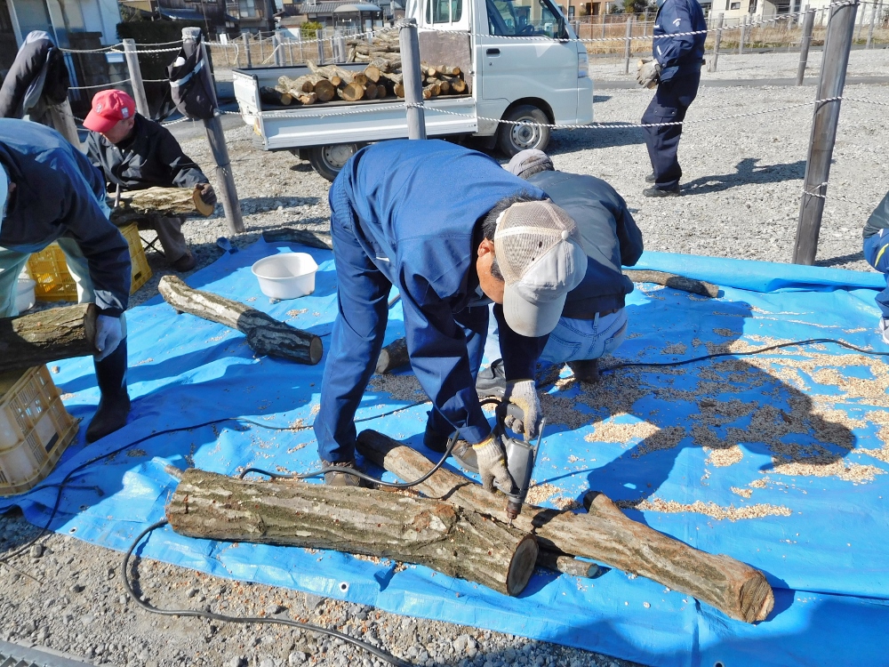 ホダ木には約15cm程度の間隔で穴をあけシイタケ菌を打ち込みます。シイタケ菌を4,000個打ち込みました。このホダ木を軽トラ2台でホダ場へ運搬。ホダ場は八幡公園西側の八竹会所有の竹林です。
