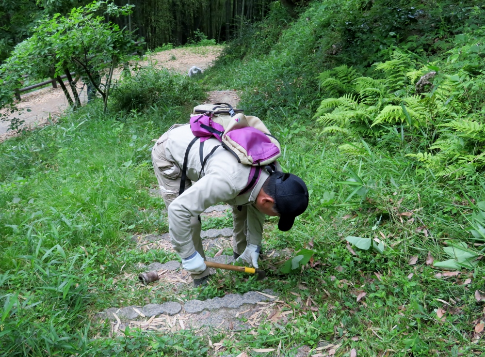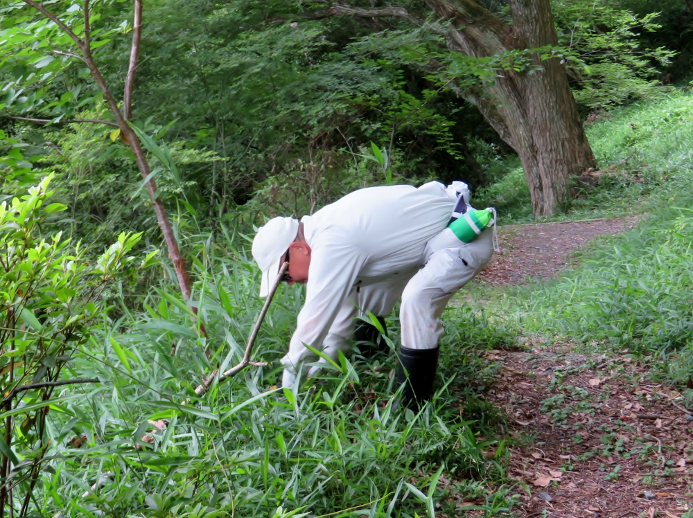 いつものように公園管理棟前に9時に集合、Mu会長の今日の作業説明およびPR事項の発表の後集合写真を撮影、作業現場へ移動。本日の作業は 公園からの直登階段付近、および秀次銅像横の急斜面の整備を行いました。仮払い機はフル稼働、あとは釜での除草が中心の作業でした。10時ごろの途中休憩ではおいしいミカンの差し入れもあり十分に水分の補給もたっぷりとれて 後半の作業となりました。作業後はスッキリとした状態になり 11時30分頃作業終了となりました。