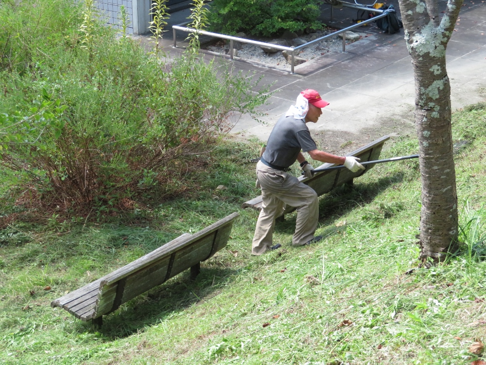 作業現場は 八幡公園からの直登階段登山道の整備です。階段および両脇に生える草の除草、不要樹木の伐採、さらに登山道近くに咲くアジサイの剪定を実施。汗びっしょりの作業となり休憩も10時前に設定。たっぷりの水分を取り後半の作業へと。後半の作業でも11時前には全員ぐったりとなり 11時に作業を終わることに。