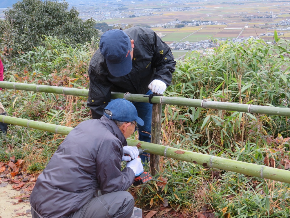 この日は八幡山頂上 西の丸と北の丸の竹柵の交換です。取り付けてから2年経過して朽ちの程度が進み危険な状態になっていました。この秋に八幡神社の駐車場に使用した竹を使っての交換です。