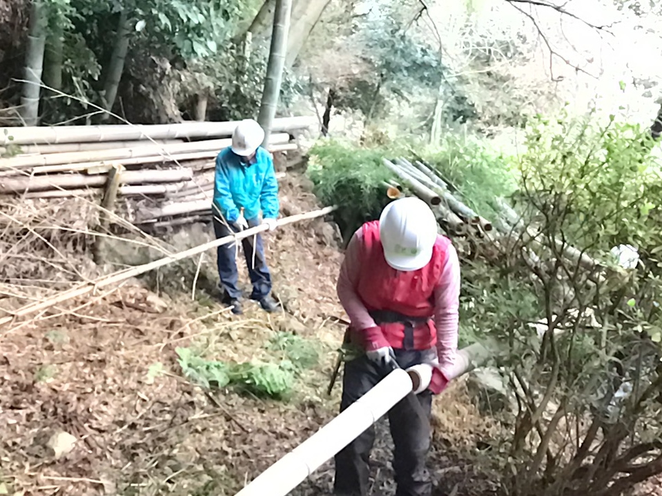 今回は本年度最終の作業日。西村太郎衛門墓上部の傾斜地にある枯れ竹処理と、その上部竹林内の枯れ竹の処理を行う。斜面にある枯れ竹を下に落としてチェンソーでカットする。また竹積場にあった若竹も数本処理する。上部台地場でも同様に作業する。杉春稲荷神社周辺の枯れ枝も落として貰う。(落下した枝で陶器製の椅子を破損させた模様)墓上部斜面の雑木幼木も全て処理し、スッキリする。