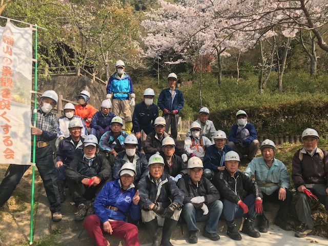 春の温暖な青空の元、久しぶりに多い人数の参加となる(24名の参加)。今回からは東端の神社所有の竹林の整備を行う。上中下段に分かれての作業。宮内町のスロープ際と上部の竹林で立ち枯れ竹を伐倒裁断する。一年ぶりとは言えかなり多くの立ち枯れ竹があり、チェンソー3台をフル稼働させて処理する。途中10時に休憩し、11時15分で作業終了する。次回も続きで作業する予定。