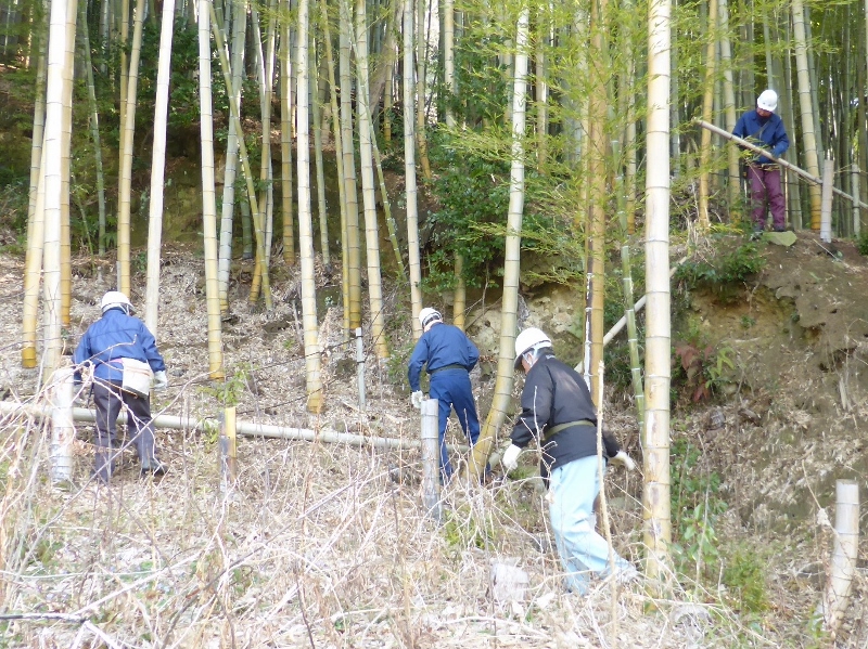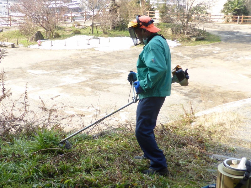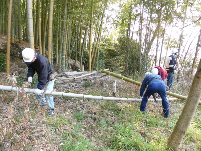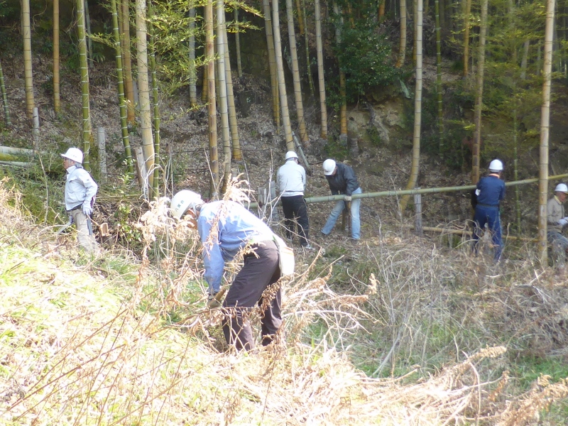 久しぶりに八幡山東公園の上部竹林の整備作業。前日までの冬の寒さが和らぎ 梅も咲き出す早春の整備作業となりました。草刈機3台で枯れた雑草刈り 他のメンバーは竹林際に展開して立ち枯れ竹の伐採処理をする。日焼けした竹と枯れた竹を判別しながら切り倒し、適当な長さに切って積載する。  途中上部から切り倒した竹の先端部が下の作業者のヘルメットを直撃する事故が起こる。長い竹の為、その点を含んで周囲への注意の声掛けが必要なことを改めて実感する。