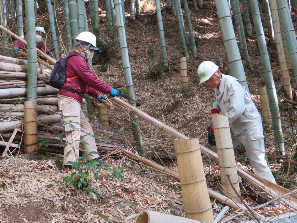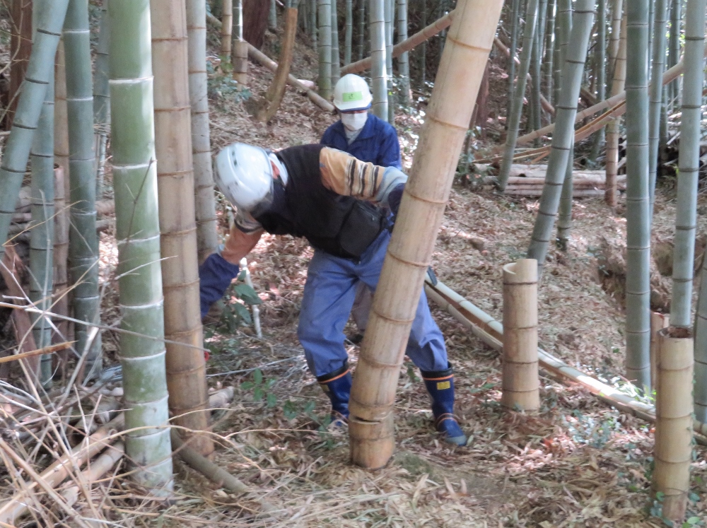 本日の作業場は八幡東公園の東側にある竹林の整備です。立ち枯れ竹や折れた竹の伐倒処理です。切り倒す時には声を掛け合い 危険を防止しながらの作業でした。