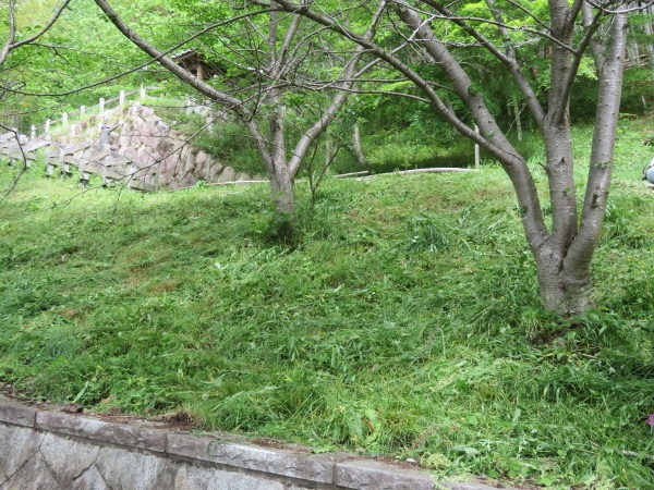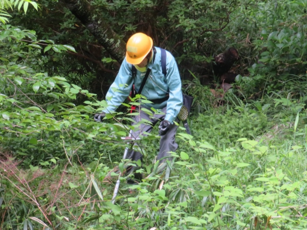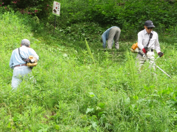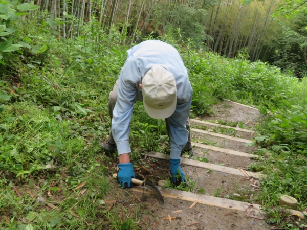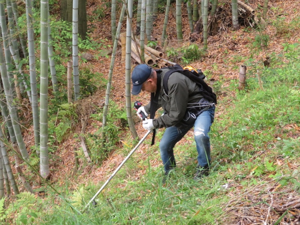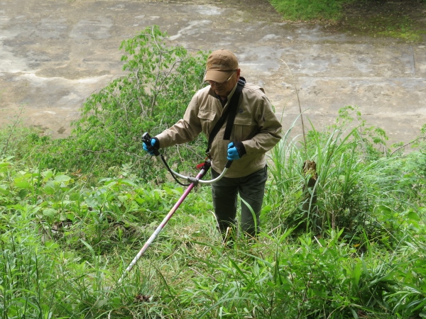 この日から 竹林の整備作業からコナラ林の整備活動に代わります。まず最初の日は八幡東公園の周辺の整備です。草刈り機10台 フル活用で広い場所に散らばり草刈りを行います。階段周辺や石垣の除草は鎌の作業で進めました。10時に途中休憩を取り11時過ぎに作業を終わりました。