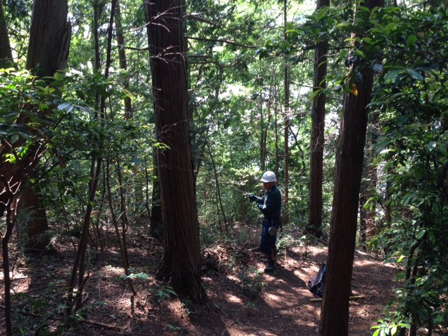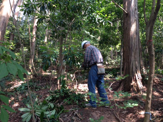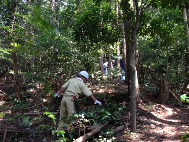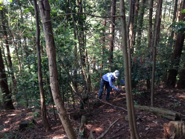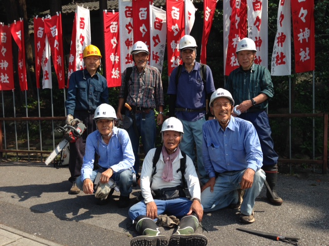 隊長以下計8名での取り組みでした。百百神社から10分ほどの急坂を登って作業現場に到着。何本かの立ち枯れ松をチェンソーで伐採して、枯れ枝が散乱しているのを順次手間をかけて纏めていく。登山道脇の檜幼木や常緑樹等も伐採して、見通しを良くする。3年半掛って八幡山北の丸を皮切りに順次整備を進めてきたが、ようやく次回の作業で完了の見込み。