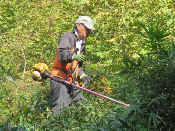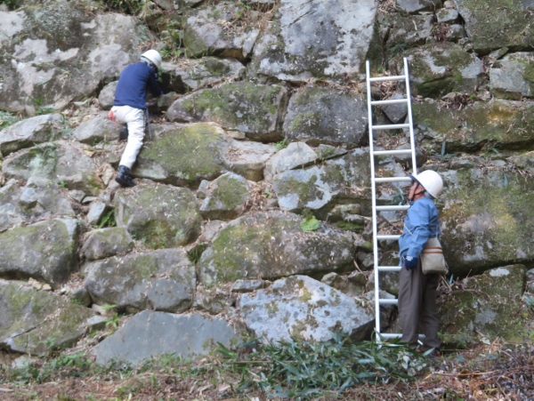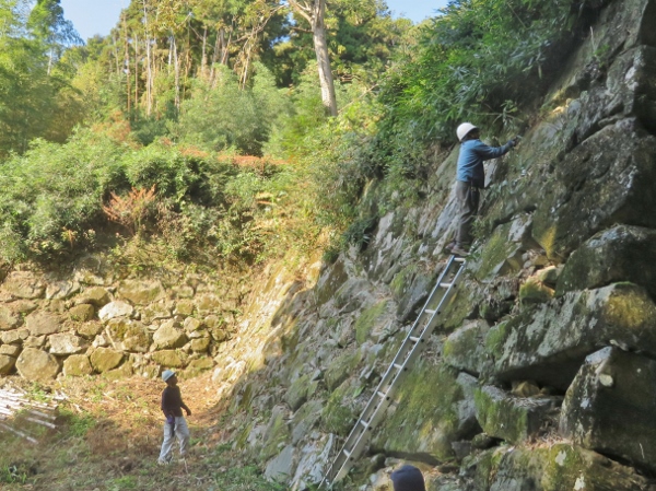 今回の作業場所は前回やり残した秀次屋敷跡近くの石垣付近の整備です。石垣には長梯子を使って石垣にとりついての作業です。石垣の上の平地では草刈り機を使います。土手に繁茂していた細高い木はほぼ除きました(天ぷらの高級食材 春のタラの芽の木はわざと残しています)。途中休憩を取りながら作業を進め11時過ぎには作業を終えました。