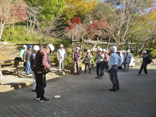 2.朝のミーティングと 会長からの親子ハイキングの報告及び本日の作業説明: