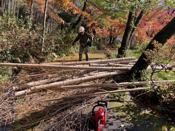本日の作業は前回に続き大石垣山側の竹林と西村太郎右衛門の墓後部の斜面にも立ち枯れ竹が多く伐倒処理しました。各々かなりの本数を処理頂きました。