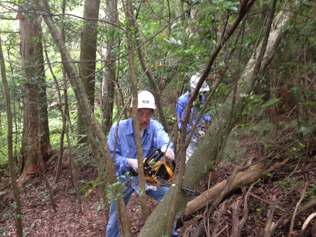 思えば途中の作業では、山下から現場まで1時間もかけて上り下りしながら作業を続け、作業での怪我もあったが何とか無事にここまで来たという感じです。途中チェンソーでどれだけの量の立ち枯れ松を倒した事か。
