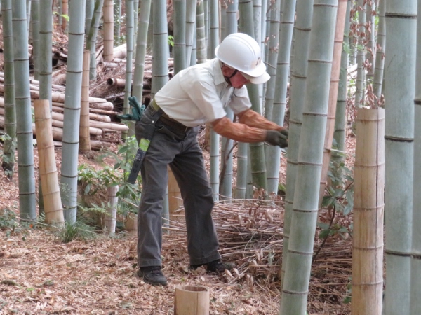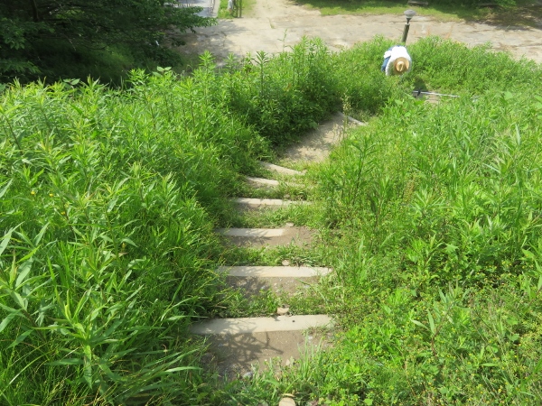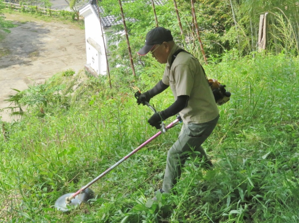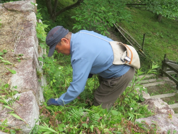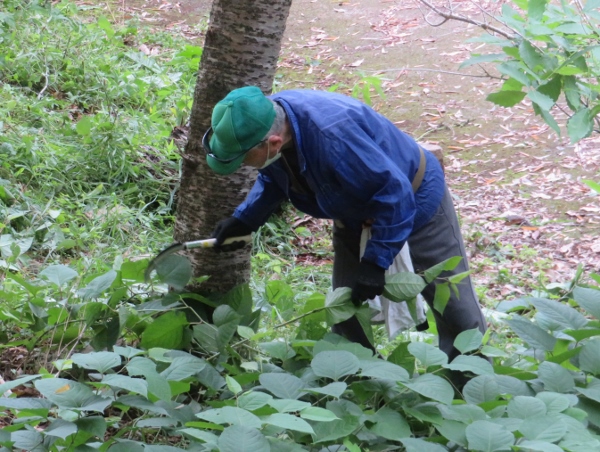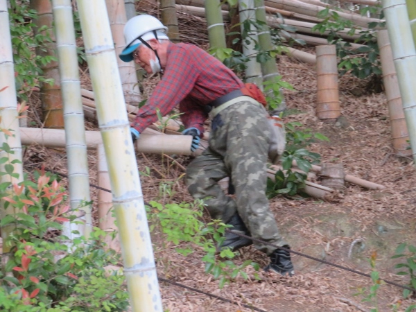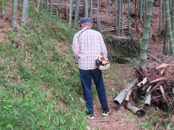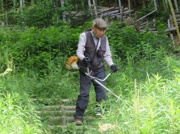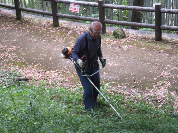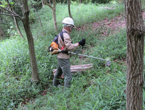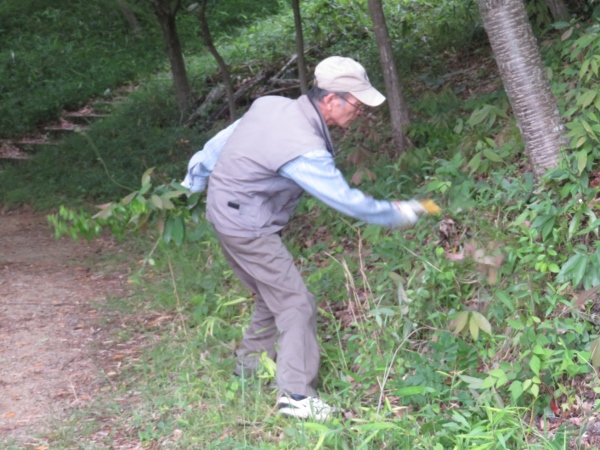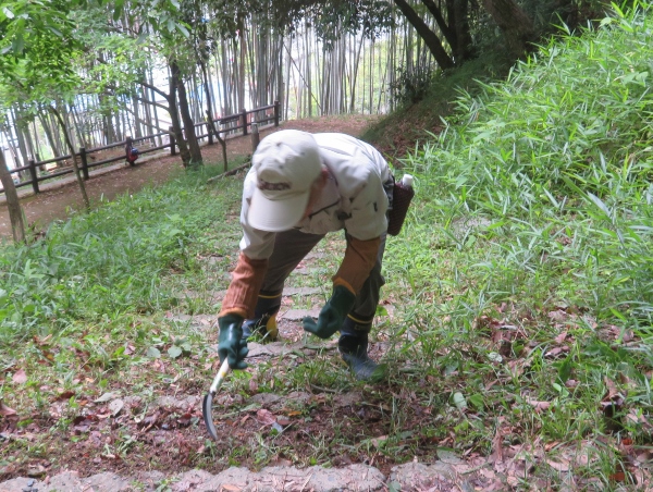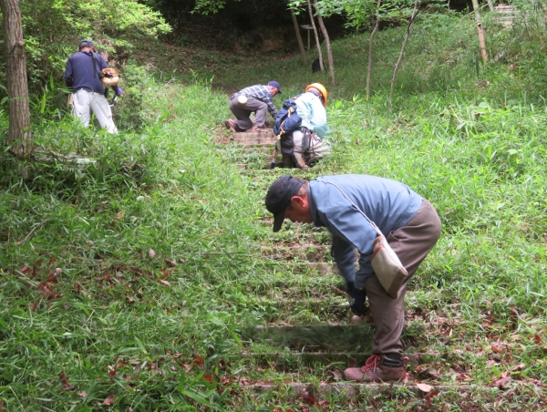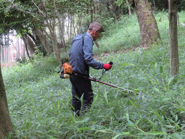 この日の活動は東屋がある直登階段付近の整備です。草刈り機では一面に繁った笹竹の刈り取り作業、一方鎌作業では階段の草取りや伸びた蔓の除去、新しく伸びてきた不要竹の伐採などです。