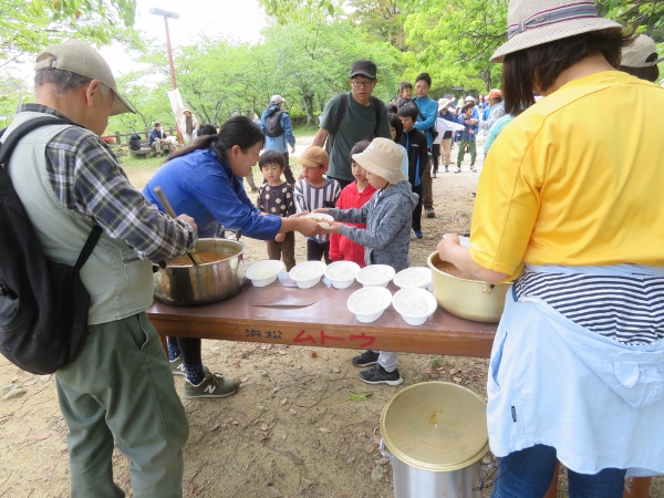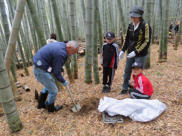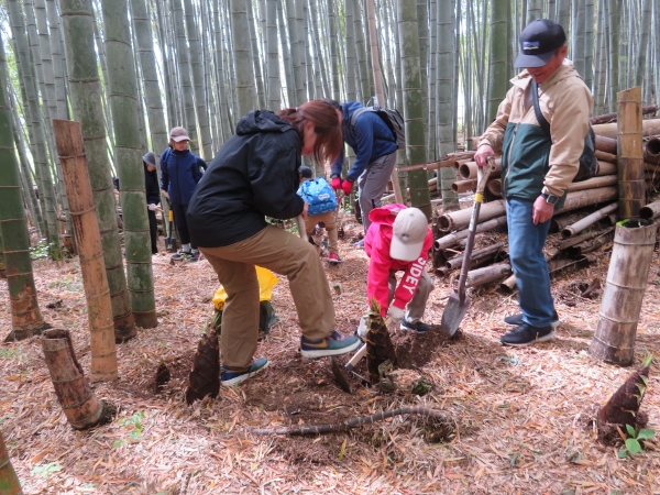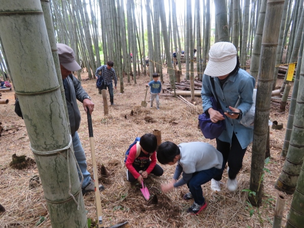 スタッフは8時集合、ミーティング前から多くのメンバーが準備を始めています。ミーティングで今日の取り組み内容の説明があり、8時半には最初の受付が始まりました。9時に公園広場で全体集会があり会長の挨拶と取り組み内容の説明、市長からの挨拶も受け賜わり グループごと決められた現場に移動。筍堀開始。各家族共多くのタケノコを掘り上げ満足された様子。