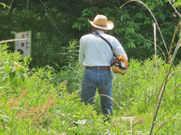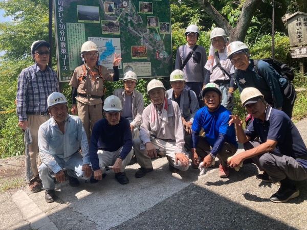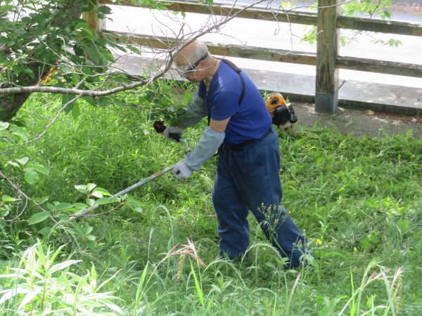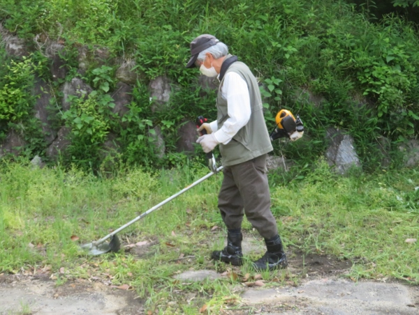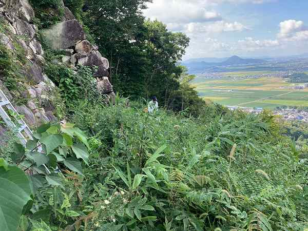 この日は縦走路の定例作業日で、15人で草刈機6台を使い出丸台地周辺の除草をしました。夏草が背高く成長して、出丸の眺望を妨げていたので除草の結果綺麗に見える様になりました。